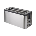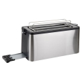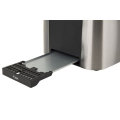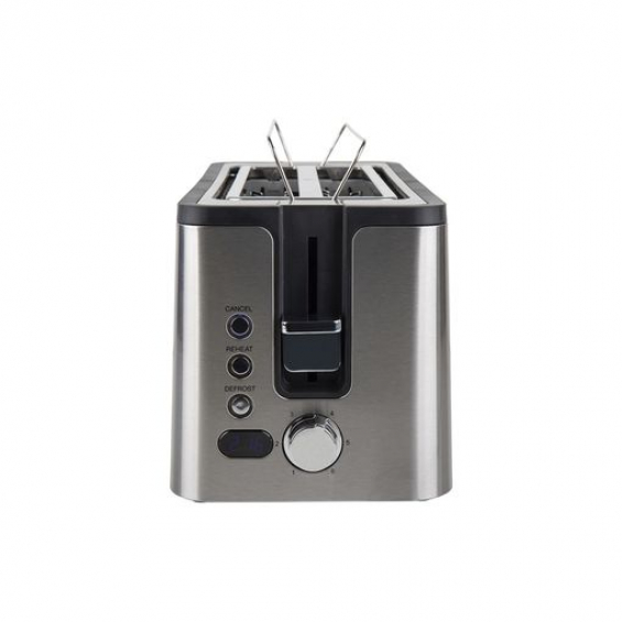 Tostador de pan Modelo Pasiego de alta calidad, antihuellas, con pantalla digital y dos ranuras grandes con capacidad para 4 trozos de pan. En la pantalla aparece un temporizador que muestra el tiempo de tostado. Cuenta con varillas integradas (efecto parecido al grill), que se adaptan a cualquier alimento, desde bollos, magdalenas, tortas o croissants, y se calienta simplemente colocándolos encima de la varillas. Dispone de 3 pulsadores: calentar, descongelar y cancelar. Incorpora un botón de parada para terminar el proceso de tostado, una tecla de descongelación y calentamiento con 6 niveles electrónicos de tostado variables, que permiten ajustar el tiempo de calor según sea necesario. Cuenta con un apagado automático y guías autocentrantes. Incluye una bandeja extraíble para migas.