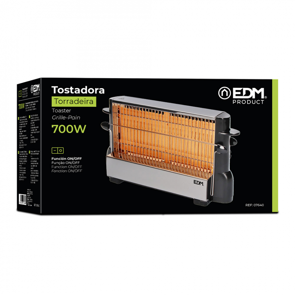 Tostadora vertical potencia 700w. calentador de placa de mica.tueste por los dos lados. interruptor encendido/apagado. cuerpo y parrilla de acero inoxidable. hasta 4 rebanadas a la vez. capacidad para cualquier tamaño o tipo de pan. dimensiones: 28x9x18cm (ancho/fondo/alto) 220-240v 50hz edm