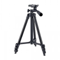 Tripode ligero, incluye nivelador, rosca 1/4, palanca de 90° y de 360° de aleacion de aluminio, palancas de bloqueo de alturas y de elevacion del eje central, manivela de ajuste de angulo vertical. con tope de gomas antideslizantes. fabricado en aluminio y plastico. para linternas, dispositivos moviles, camaras compactas, proyectores que incorporen rosca hembra de 1/4 (no incluye adaptador para los que no disponen de ella). altura regulable entre 33 y 103 cm, diametro máximo de la base ø55cm. peso máx. 1kg. incluye bolsa de tela.