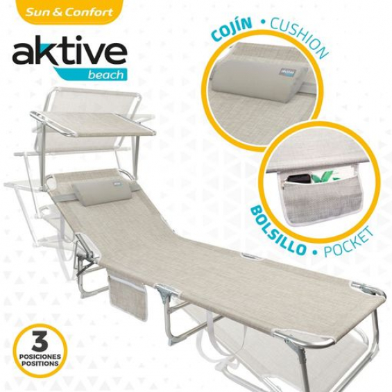 Tumbona plegable Aktive Beach con respaldo regulable en 3 posiciones. Tiene unas medidas abierta de 188x58x30/69 cm y cerrada 72x62 cm. Incorpora cojín, bolsillo lateral y parasol. Está fabricada con estructura con tubos de 22 mm de diámetro de alta resistencia combinados con tejido de textileno en color beige. Tiene patas con topes antivuelco y antideslizantes, ideal para arena o césped. Es ligera y de pliegue compacto, incluye 2 asas y soporta hasta 110 kg de peso.- Tumbona plegable Aktive Beach con la que sentirás la máxima comodidad- Cómoda y funcional: respaldo con 3 posiciones, incluye cojín extraíble, parasol y bolsillo lateral con cremallera, mide abierta 188x58x30/69 cm y cerrada 72x62 cm- Resistente y segura: estructura de aluminio, soporta hasta 110 kg de peso y patas con topes antivuelco para mayor estabilidad- Diseño: asiento de tejido de textileno impermebale y lavable en color beige- Transporte: incorpora asa de transporte para trasladar cómodamente