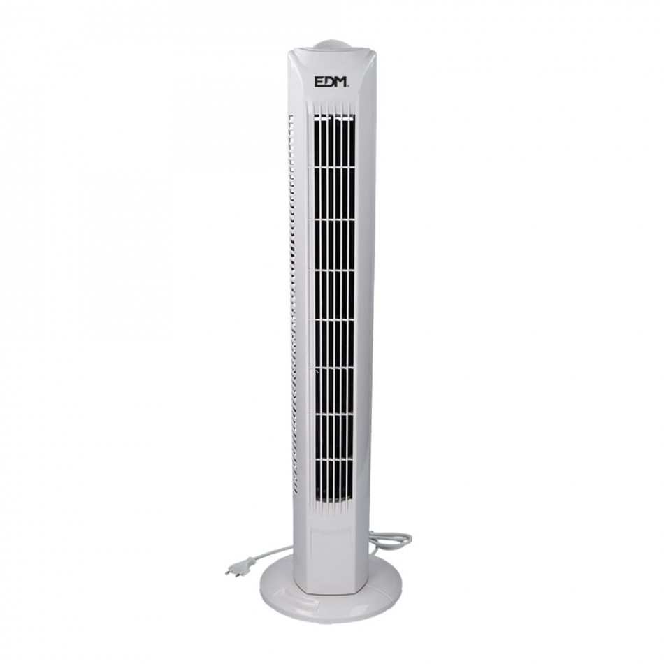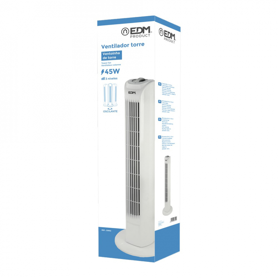 Ventilador de torre. color blanco. potencia: 45w 3 velocidades. medidas: 21x78cm (ancho/alto) cabezal ajustable/oscilante 60° caudal aire 1920m³/h silencioso 220-240v - 50hz