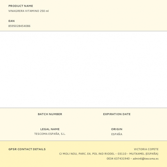 Vinagrera vitamino 250 ml, fabricada en vidrio borosilicato, la boquilla de silicona y el tapón de plástico resistente. apto para lavavajillas