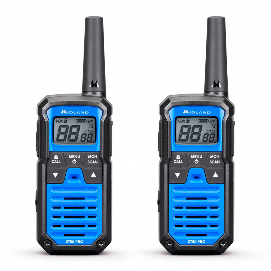 Pareja de radiotransmisores de 16 canales pmr446 (446.00625-446.19375 mhz) con un alcance de hasta 8 km y una autonomía de 12 horas (pilas incluidas, baterías ni-mh 700 mah). transceptor dual band lpd/pmr446 con 85 canales: 16 pmr446 (500 mw erp) y 69 lpd (10 mw erp). impermeable ipx2, vox con 6 niveles, silenciador de tono al finalizar la transmisión, pantalla de cristal líquido retroiluminada, 38 subtonos ctcss y 83 códigos dcs en tx y rx. incluye bloqueo de teclas, función scan, monitor, indicador del nivel de batería y ahorro automático de energía. también tiene tecla de llamada, toma spk/mic 2 pin midland, puerto micro usb y cable de carga incluido. color azul. dimensiones: 48 x 29 x 90 mm