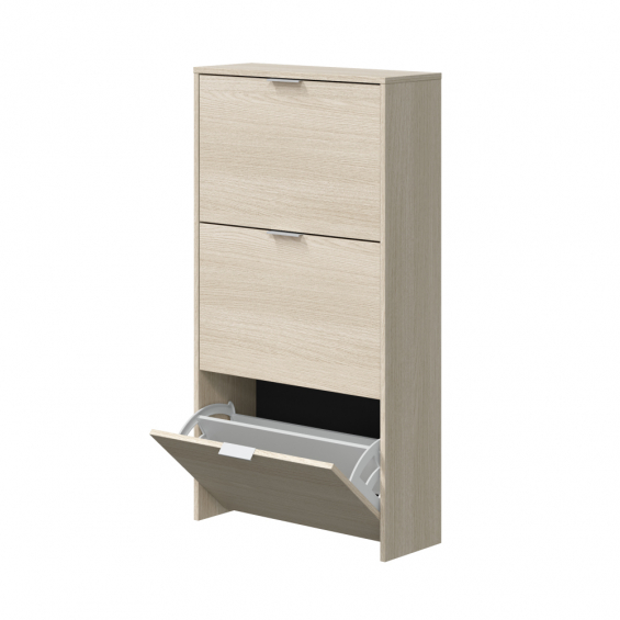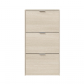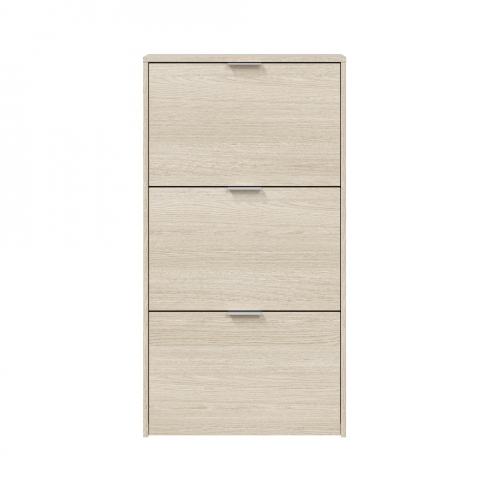 Mueble zapatero con 3 puertas abatibles de color roble. capacidad: 18 pares de zapatos aproximadamente. material: melamina. contiene: sistema abatible abs de dos bandejas para las puertas abatibles, tacos abs quitarruidos y antirayas y tiradores metálicos. medidas: 60 x 22 x 113 cm